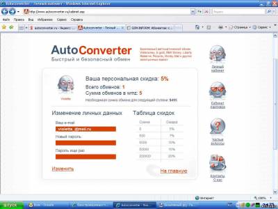 | www.autoconverter.ru Электронный обменный пункт. Интересен своей системой скидок. Все зависит от суммы переводов. Сумма Скидка 0 5% 500 7% 5000 10% 50000 15% 200000 20% Также скидки начисляются за привлеченных людей, бывают скидки от партнеров обменника. Вывод быстрый и всегда по выгодному курсу. Ссылка принята. Оплачена! Ваша реф-ссылка будет добавлена на страницу с базой проверенных проектов.