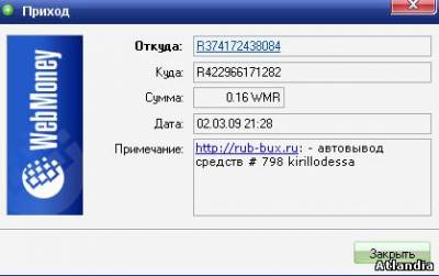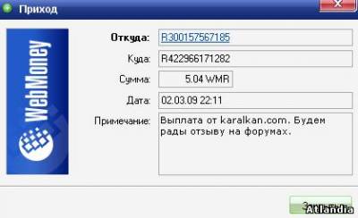 | Приняв участие в создании базы проверенных проектов заработка в Интернет, Вы можете заработать. За предоставление 1-й ссылки на проверенный Вами лично проект Вы получаета 10 центов. Условия: 1. В этой теме Вы размещаете ссылку на главную страницу проекта о заработке. В одном сообщении 1-а ссылка. ( почтовик, САР, партнерская программа и т. д) 2. Краткое описание системы (проекта). 3. Предоставляете доказательства получения Вами выплат: - скрин статистики Вашего аккаунта; - скрин полученной выплаты. Оплата:10 центов за каждую проверенную администрацией ссылку. Оплата производится прямым платежем на Ваш WMZ-кошелек указанный в Вашем профиле при регистрации в нашем проекте. В дальнейшем Ваша рефссылка размещается в нашей базе и будет доступна всем пользователям ЭТЛАНДИИ. Все пользователи зарегистрировавшиеся по Вашей ссылке становятся Вашими рефералами. Предупреждение: 1. Доказательства должны быть достоверными. 2. Скрины должны быть реальными. 3. Скрины выплат должны быть свежими и датированы начиная с 10-го апреля 2009г . 4. Не выкладывайте ссылки на уже имеющиеся в данной теме проекты Проверяйте по базе: ЗДЕСЬ УДАЛЕННЫЕ ИЗ БАЗЫ ПРОЕКТЫ ЗДЕСЬ ПРИМЕР ВАШЕГО СООБЩЕНИЯ: http://www.wmmail.ru WMmail - Сервис почтовых рассылок. Оплата за чтение почты. Оплата за серфинг. Оплата за выполнение заданий. 5 уровней рефералов (10%, 5%, 2%, 1%, 1%). Партнерская программа. Минимальная сумма для выплаты 10 центов. Скрины: